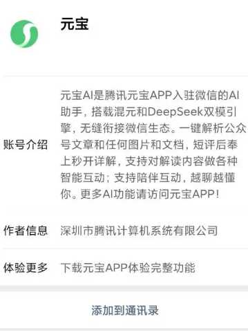 此外,用户可以将元宝添加到通讯录,就可以在聊天列表和联系人名单中看到元宝。