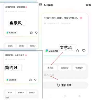 2,AI手机自动生成朋友圈文案,可选择不同风格, (文艺、幽默、简约等)字数、表情等。还可以输入主题  |