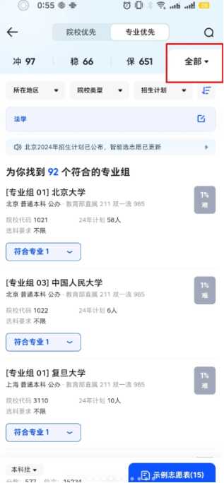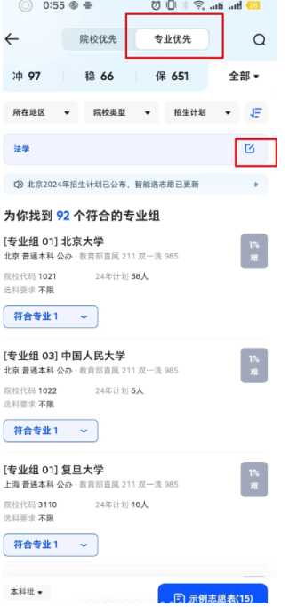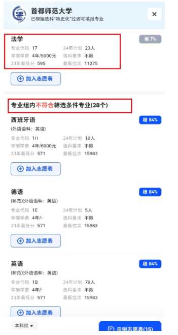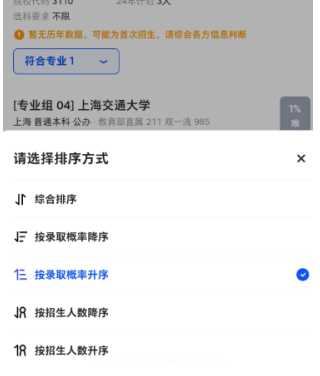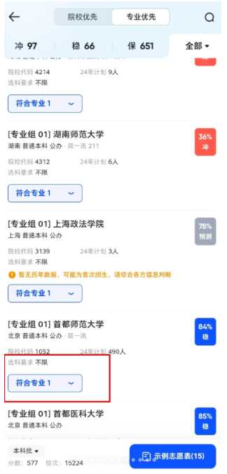 6,逐个点击“符合专业”按钮,关注该院校该专业招生信息和录取难度(比照该专业录取位次——注意不是院校最低录取位次),关注该专业组下“不符合筛选条件”的专业;