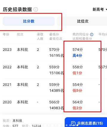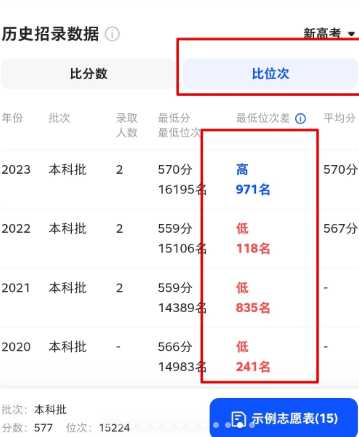 8,将经过以上筛选的院校,按照录取难度依次加入志愿表,对照过去三年该专业录取同位分和位次,确定志愿结构:建议+10%位次以内的院校专业组为“冲”,过去三年都能稳上(位次−10%至-30%)的为“稳”,过去三年都能稳上(位次-30%-50%)且王牌专业为自己意向专业的院校为“保”