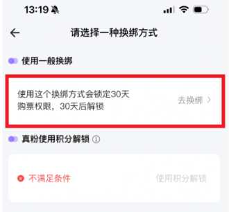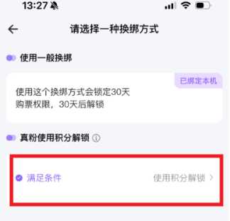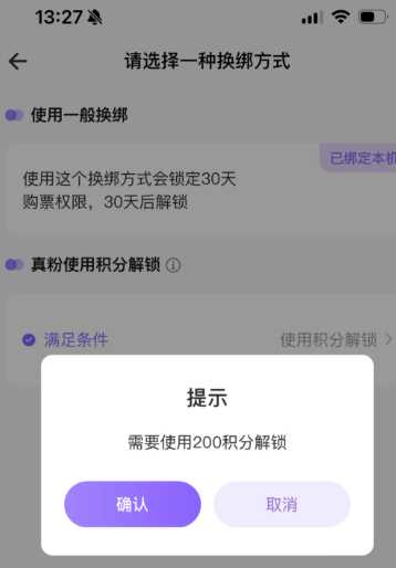 使用200积分操作的是换绑设备,不是解除30天不允许购票的限制。 也就是说如果不满足上面的条件,没有200积分,你的账号一旦绑定了设备就不能换绑了。满足条件的情况下一年可以用积分操作一次设备换绑,换绑后30天内依然是不能购票的,30天后才可以正常购票。 JJ20设备绑定规则【粉丝解锁】 注册时间超过90天并且保存有JJ漂流瓶的用户,可以将您的账号登陆在绑定设备上,并使用200积分解锁绑定设备限制。365天内只能使用一次 【误触模拟器锁定】 某些时代久远的Android机型会出现模拟器限制无法绑定,请联系客服处理。 |