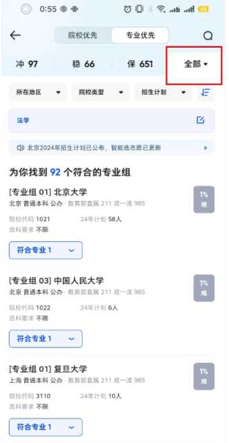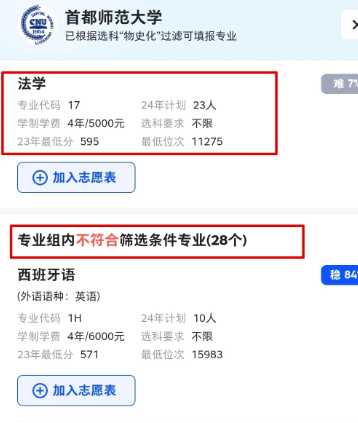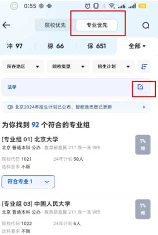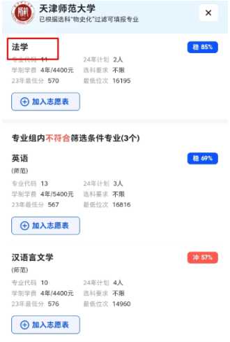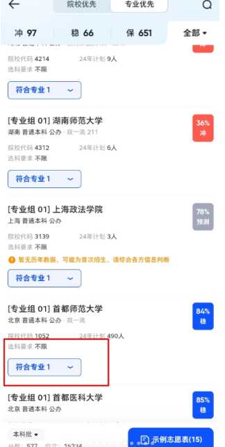 6,逐个点击“符合专业”按钮,关注该院校该专业招生信息和录取难度(比照该专业录取位次——注意不是院校最低录取位次),关注该专业组下“不符合筛选条件”的专业;