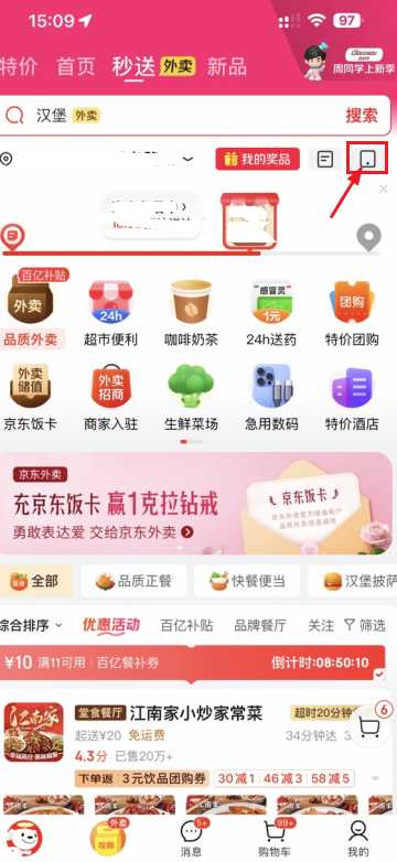 京东秒送外卖添加到桌面怎么弄教程1, 打开京东app,点击秒送页面,点击小编画圈的地方;