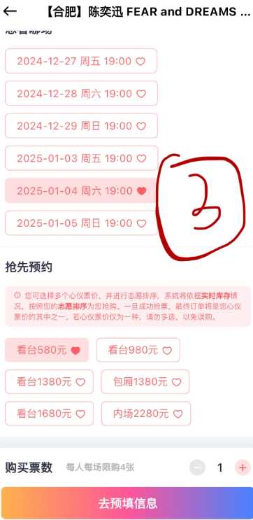 3,选择意向场和价位,可以选择多个心仪价位按志愿顺序抢票,如果只想要一种就别多选;
