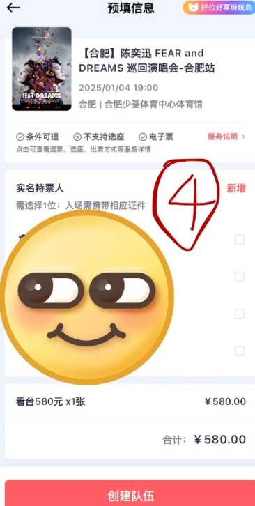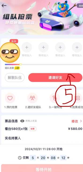 5,邀请朋友一起抢票,只要进队伍就行,身份信息你已经填好了,如果要改动身份信息可以直接修改,不用解散再开(规则是可以邀请不看演唱会的朋友抢票,最优解肯定是多开几个队伍,例如四个人一人开一个队伍最多可以有20人一起抢,一人可以喊四个人,但一个人最多参加一个队伍)