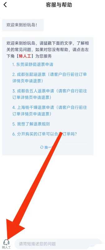 点击【转人工】,即可在纷玩岛APP找到人工客服。
