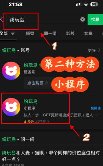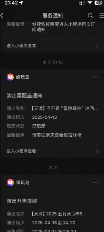 第2种方法(iOS和安卓版) 【小程序搜纷玩岛—右上角…—左下角设置—订阅信息—演出票配座通知开启】(如果没有这个选项就重启微信) 1,微信小程序搜索纷玩岛