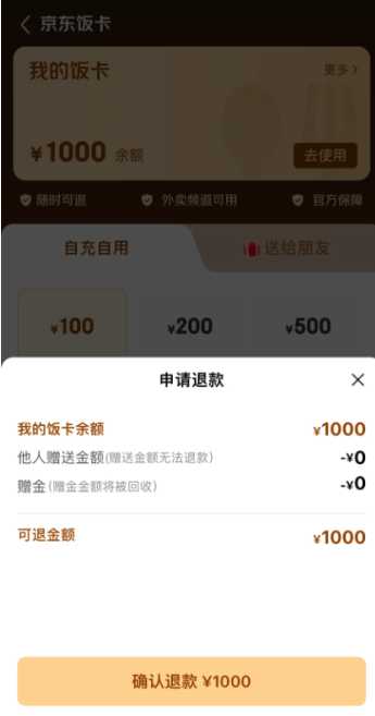 近日京东外卖上线了京东饭卡,可自用可送礼,而且还可以和优惠券叠加,有活动的时候还有充100返20元外卖券的活动,力度还是很大的,那京东饭卡退款优惠券还在吗?京东饭卡钱在哪里退款啊?下面就和小编一起来看看吧。