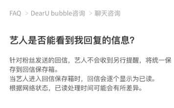 bubble的已读是真的吗不一定的。 针对粉丝发送的回信,艺人不会收到另行提醒,将统一保存到回信保存箱。 当艺人进入回信保存箱时,回信会逐个显示为已读。根据网络状态,已读处理时间可能会有所差异。