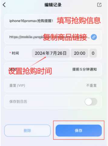 填写标题(比如iPhone16promax提醒) 商品链接从平台复制 设置具体时间 选择提前5️⃣分钟通知 点击保存(图3)