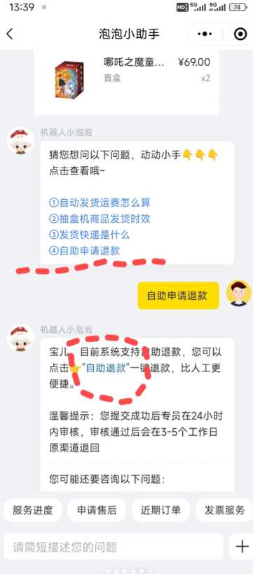 泡泡玛特小程序怎么申请退款那天一个冲动在小程序买了两个哪吒的盲盒,后面发现要三月底才能发货,刚好附近门店有,就果断退了。 重要一点:抽盒机抽的盲盒是没有办法退款的噢抽盒机抽的,已经开盒知道里面是什么的就不能退了的,只有直接下单不知道里面是什么的才能退。 以下是退款步骤:先打开ppmt小程序——我的——客服中心——联系在线客服——选择要退款的订单——选择 自助申请退款——再选择机器人 对话框里的 自助退款——然后耐心等待就行了