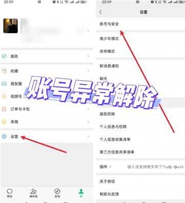 微信加好友提示账号异常怎么消除1,打开我们的微信,然后能看到底部有4个栏目,分别是“微信”、“通讯录”“发现”和“我”,我们需要点击【我】然后在7个选项中我们点击最后一项【设置】,进入设置后,我们需要找到并点击账号与安全;