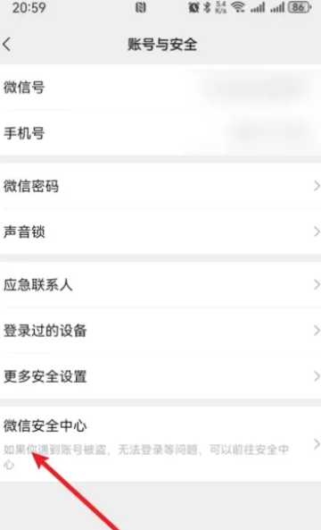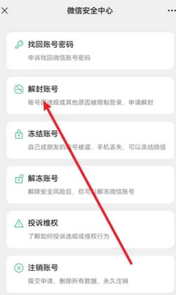 2,进入账号与安全界面后,我们需要点击最后一项的【微信安全中心】,然后就能看到【解封账号】的申请入口;