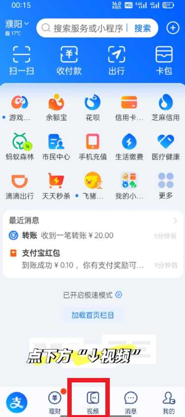 支付宝刷视频领红包攻略1,打开支付宝,点击下方小视频;