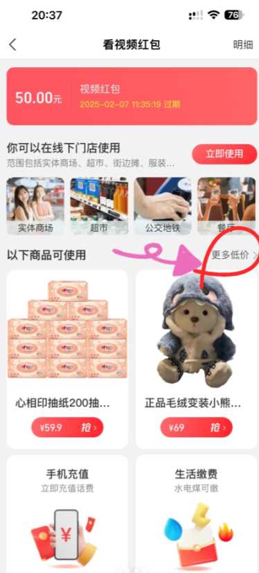 支付宝刷视频红包可以干嘛这个红包可以线下吃饭、消费、坐地铁等,也可以点击“更多低价”(图里箭头标示的地方)线上使用。我拿到的红包都是买了金豆,24年底觉醒买的金,现在都已经升值了好几千啦  |