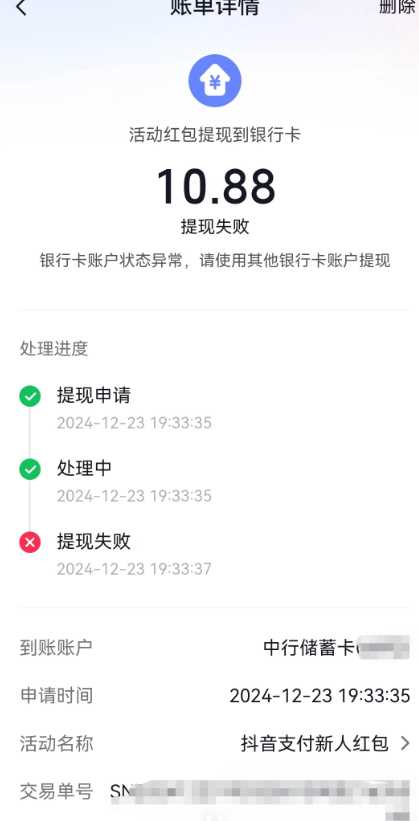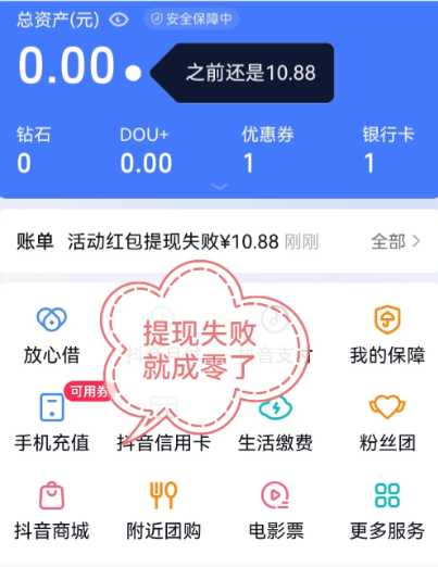 想着要提现到银行卡里,提现之后才意识到这是一个抖音红包活动,提现失败也不能继续提现了,突然变成零,但我的银行卡一直是常用的,没有异常情况!,所以推测这只是诱导大家去绑银行卡的一个手段罢了