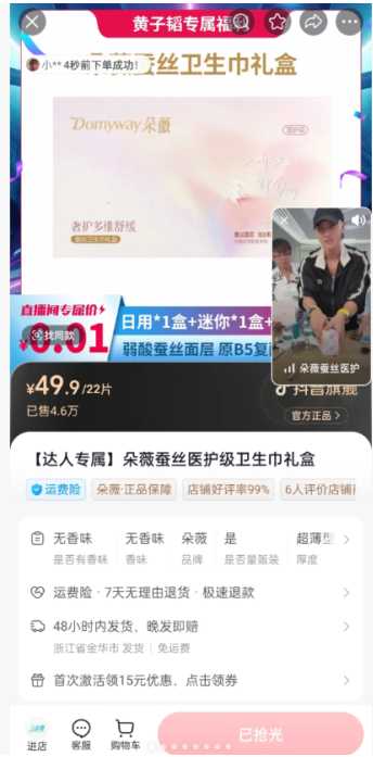 黄子韬卫生巾在哪里买前几天的0.01元试用是在抖音黄子韬直播间开售的,估计正式售卖的时候也是在抖音直播间,大家可以抖音搜索关注一下黄子韬的个人账户,最新的发售信息他都会第一时间在这里公布的,正式开售预计要等到五月份左右了。
