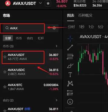 11、在搜索框输入AVAX,选择AVAX/USDT交易对,可以看到AVAX实时行情