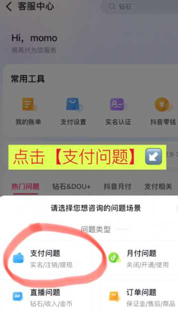 3、客服中心,点击底部【在线客服】,选择要咨询的问题场景,点【支付问题】