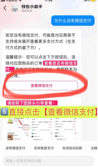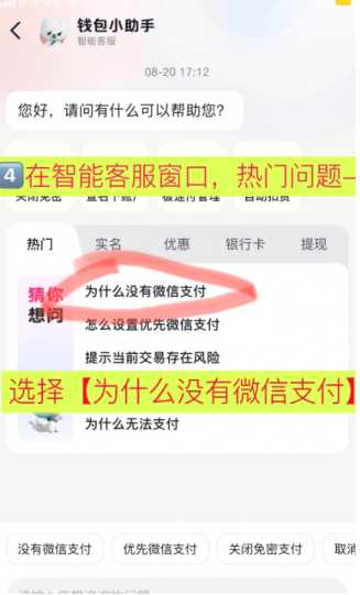 4、进入钱包小助手智能客服窗口,会有一些热门的问题,直接选择【为什么没有微信支付】