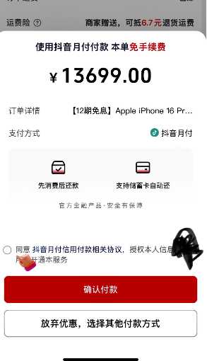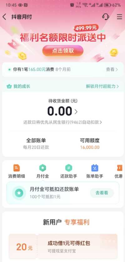 需要注意的是,抖音月付的账单日+和还款日是固定的,账单日为每月1日,还款日为每月6日。如果用户在账单日之前进行了消费,那么这笔消费将会在下个月的账单中显示,用户需要在下个月的还款日之前进行还款。如果用户在账单日之后进行了消费,那么这笔消费将会在下下个月的账单中显示,用户需要在下下个月的还款日之前进行还款。 |