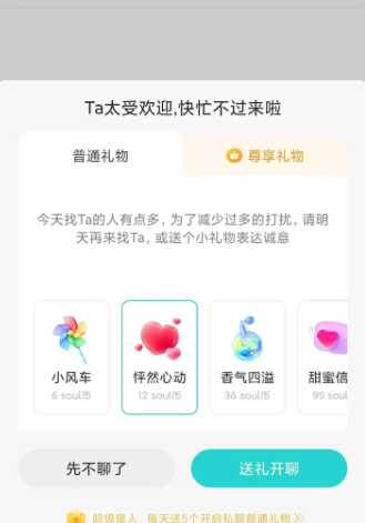 之前在广场上刷到一条瞬间,蛮有趣的,广场主人要求有想法的人私聊。好家伙,姐一点开私聊就出现了这个图标,就没说啥了,默默点了退出键。 所以这个应该是看用户的受欢迎程度而论的,如果是跟我这样的小透明聊天就不会有这样的阻碍了,不只是针对男性。 从另一个角度看,我不知道大家有没有被私信轰炸的经历,去年在soul我被轰炸过一次,这个设置也算是过滤吧,只不过那时候还没有这功能。 不过也确实有一些软件你不充值就算可以打招呼,但是会一直限制你发短信的次数,发语音或视频的价格也不一样。现在的交友软件都鬼舞蛇神的,奇怪的很。 soul聊天软件收费吗因为这是soul赚钱的一个主要渠道,这些收礼才能与其聊天的,就类似于主播平台的主播,和平台一起赚钱。礼物、soul币最终都是要花钱买的。 soul聊天技巧线上交友有一个很明显的特点,它无法让人一下子就了解你,这就需要我们首先为自己营造一个完美形象。SOUL这个交友软件很特殊的一点是,它是根据每个用户所选择的兴趣特征进行匹配交友,自动匹配与我们兴趣爱好相似的用户。所以,在注册账号时,选择引力签尽可能朝着自己感兴趣的擅长的领域多数选择,这样一定程度会增加兴趣爱好匹配人数,并且可以更多方面地展示自己。 如果颜值很高的话,咱就也别整花里花哨的,乖乖放几张自拍,都可以吸引无数颜狗。 线上聊天基本是一对多的形式,陌生聊天如何从多数人中取胜,就很考验语言魅力。一般的我们都会说“你好啊,哈喽”等等,官方都看不下去会推荐一些优美文案的,如果你不善言辞,不妨可以试一试,那个女孩子能拒绝夸奖呢。