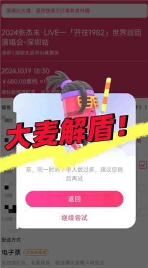 大麦被盾了怎么解除?1.抢票 app卸载重装,清除缓存 2.抢之前关机重启,并且只打开支付宝(微信支付)跟抢票 app 3.定期换一下收货地址,收货人姓名电话。 4.有条件的可以换手机去抢! 5.如果到了立即支付页面:安卓手机可以不断的点立即支付,苹果手机直接退出重新进了再点。 6.某麦尽量不要绑定淘宝登陆,绑定支付宝或者微就可以,因为绑定淘宝登陆的话,点击太快,系统会认为你是机器人,会出现滑块验证。