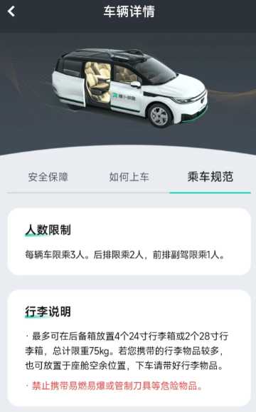 萝卜快跑后备箱可以放行李么萝卜快跑六代可以放行李的。看一下相关的要求: 最多可在后备箱放置4个24寸行李箱或2个28寸行李箱,总计限重75kg。若您携带的行李物品较多也可放置于座舱空余位置,下车请带好行李物品。