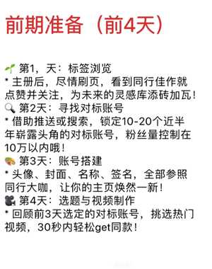 小红书起号攻略:1.注册秘籍:一机一卡,安全第一 小红书之旅从正确注册开始。 记住,为了确保安全,务必“一机一卡”注册账号。这不仅能避免账号被封,还能为账号打下稳定基础。如果你打算注册多个账号,记得更换IP和使用不同设备。同时,务必添加真实可靠的邮箱和手机号,确保账号能稳健成长。 2.关注互动:不仅是数量,更是质量 互动是小红书生态的核心。每天至少花两个小时与其他用户互动吧!关注、评论、点赞、转发... 这些看似简单的动作,其实是增加曝光度和人气的秘诀。记住,高质量的互动能吸引更多忠实粉丝,让你的账号在众多红人中脱颖而出。 3.内容制胜:质量与创意并重 “内容为王”是小红书不变的真理。确定你的内容方向,每篇文章都要字数适中、图文搭配合理、标签选择精准。内容需要新颖有趣,充满创意,才能吸引更多关注。每次更新都是展示魅力的机会! 友情提示:在小红书中,正确的养号和起号策略是成功的关键。创造优质内容,积极互动,让账号更加安全、有趣,吸引更多用户关注和喜爱。 小红书起号技巧和方法:第1天(浏览标签) 第2天(寻找对标账号) 第3天(账号搭建) 第4天(选题与视频制作) 第5天(视频发布) 第6天(账号检查) 第7天(标签破局)